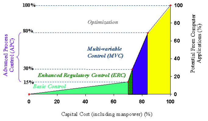 从基础控制到智能控制,是工业流程控制智能化发展的必然阶梯。在基础控制中,投入70%的成本,可以获取15%的收益。在此基础上,新增了10-15%的资本投入,预期收益将从15%增加到80%。可见智能控制是在基础控制回路的硬件投资的基础上,通过算法、软件和服务,进一步挖掘了潜能,智能控制和DCS的融合,进一步提升了效益。